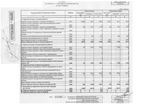 СПРАВКА ЗА ПАРИЧНИТЕ ПОТОЦИ ПО ПРЕКИЯ МЕТОД