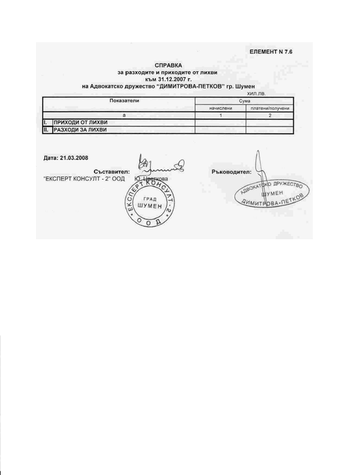СПРАВКА ЗА ПРИХОДИТЕ И РАЗХОДИТЕ ОТ ЛИХВИ