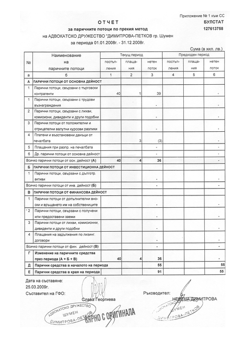 СПРАВКА ЗА ПАРИЧНИТЕ ПОТОЦИ ПО ПРЕКИЯ МЕТОД
