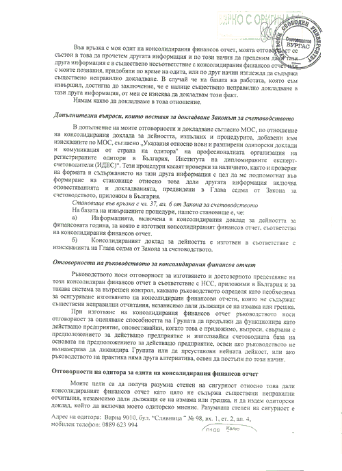 КОНСОЛИДИРАН ОДИТОРСКИ ДОКЛАД