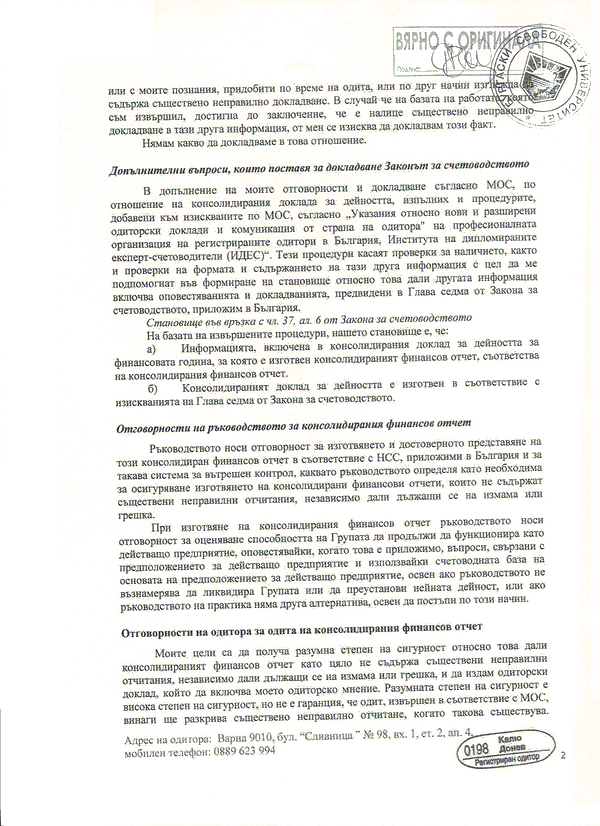 КОНСОЛИДИРАН ОДИТОРСКИ ДОКЛАД