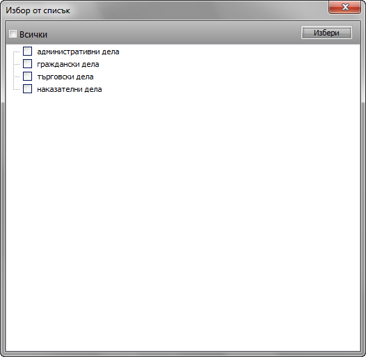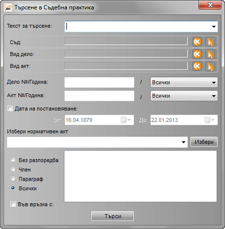 - търсенето да обхване всички видове съдебни дела или само избрани от потребителя (административни, граждански, търговски и наказателни)